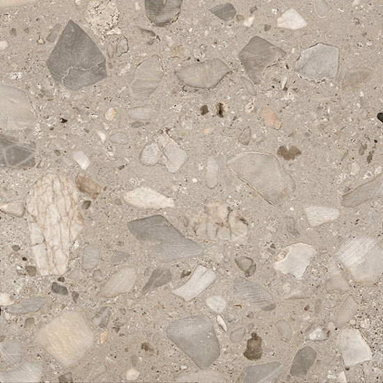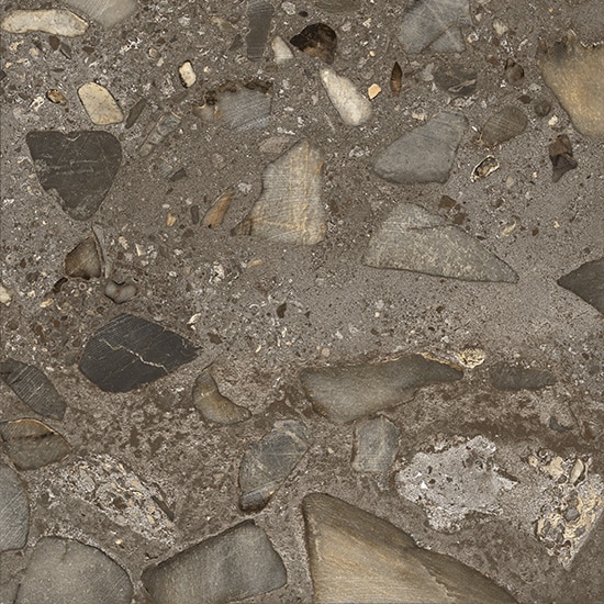 Ce grès cérame réinterprète l’esprit Terrazzo en le déclinant dans 5 teintes : White (Blanc), Sand (Sable), Copper (Cuivre), Gray (Gris) et Graphite (Gris foncé) en finition Naturelle R10 pour sols et murs.