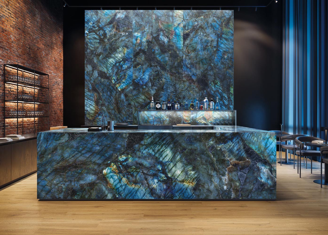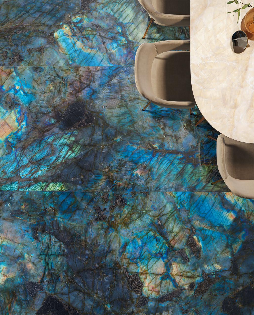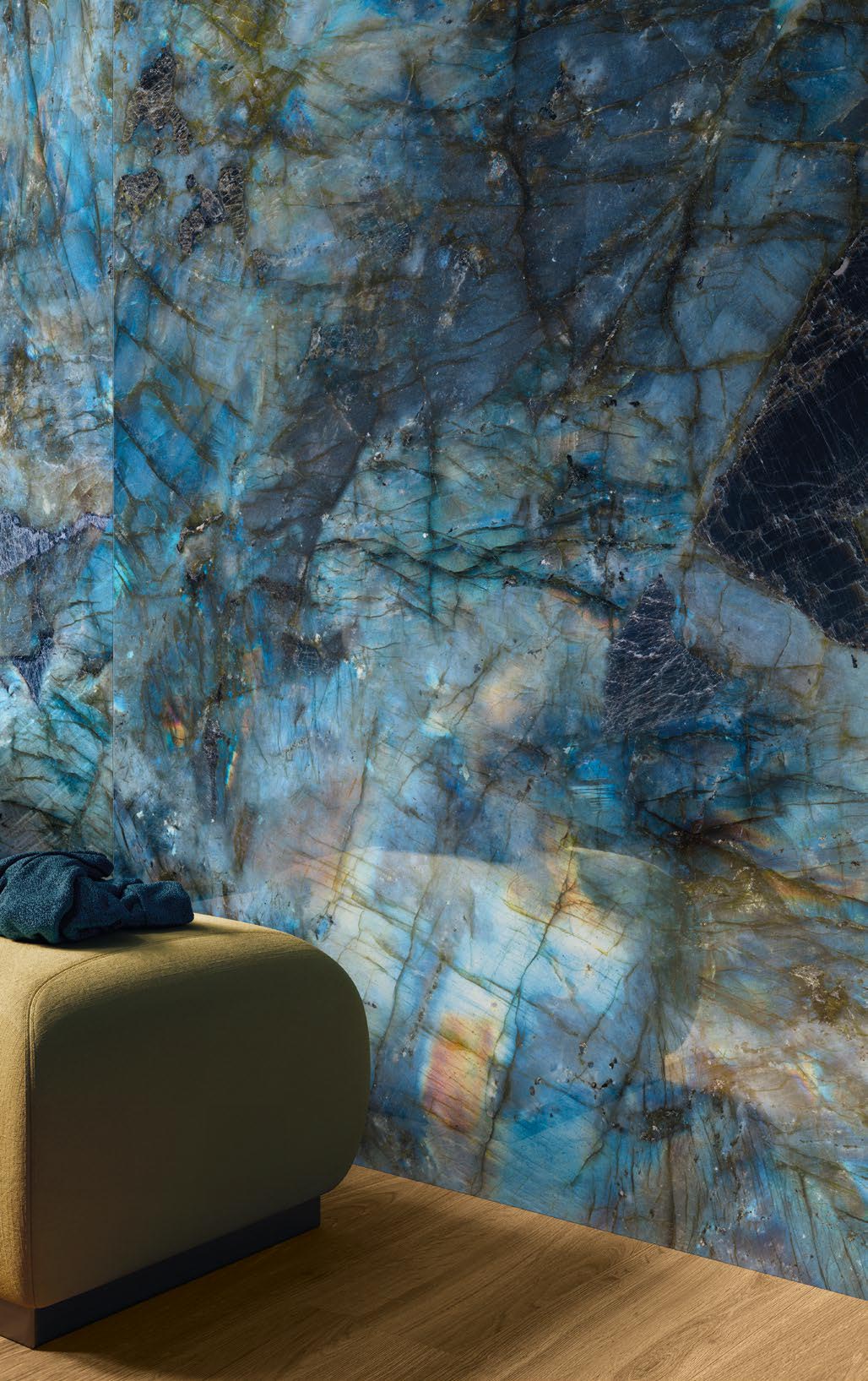 Décliné dans 3 teintes : Golden ambre, Ivoire Gioiello et Labradorite bleu.