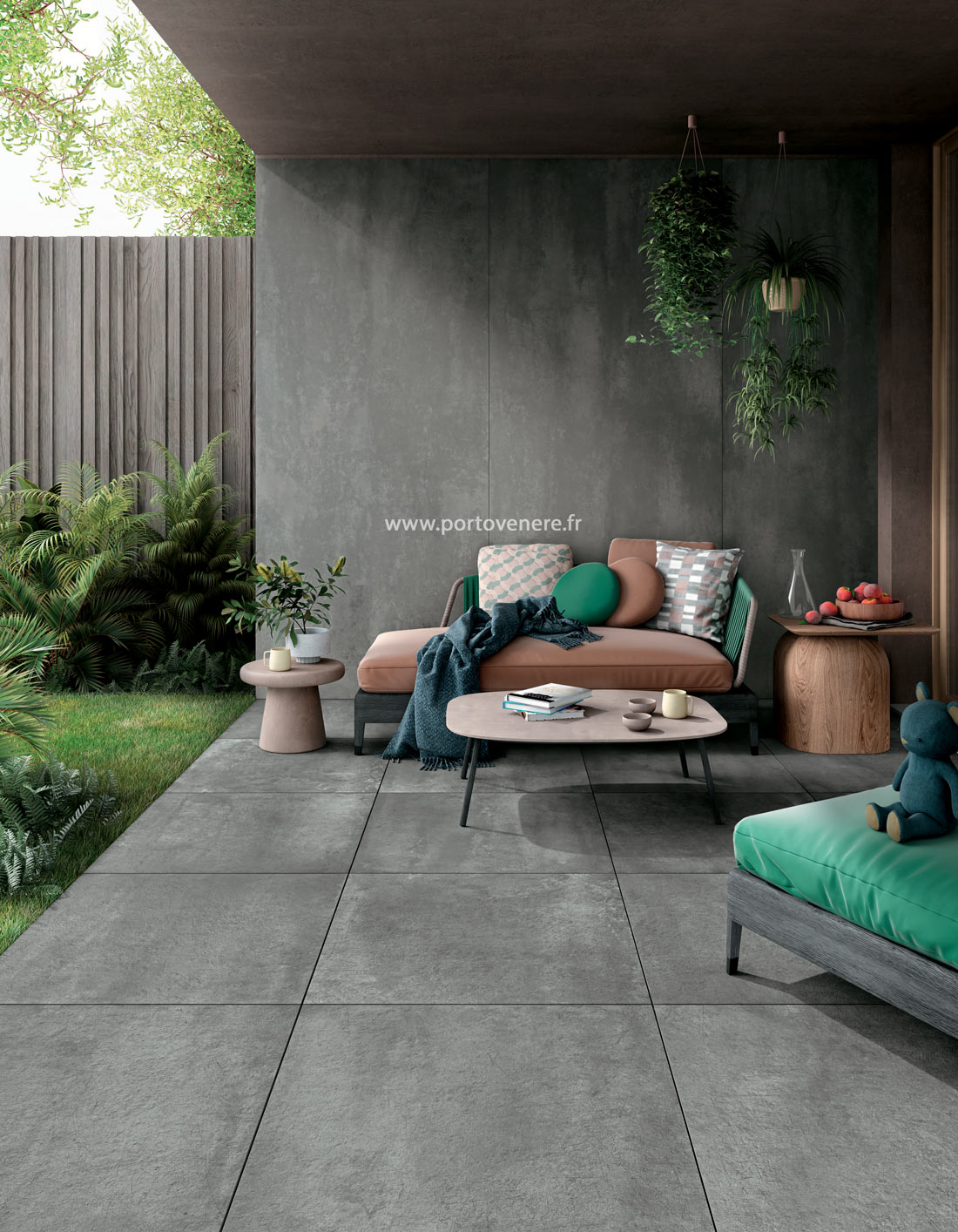 5 couleurs naturelles et 3 couleurs contemporaines pour sols et murs en intérieur et extérieur* : Un dégradé de Gris – blanc gris, sable, gris moyen, anthracite jusqu’au noir profond – complété d’un rouille remarquable, un bleu élégant et un vert envoûtant.