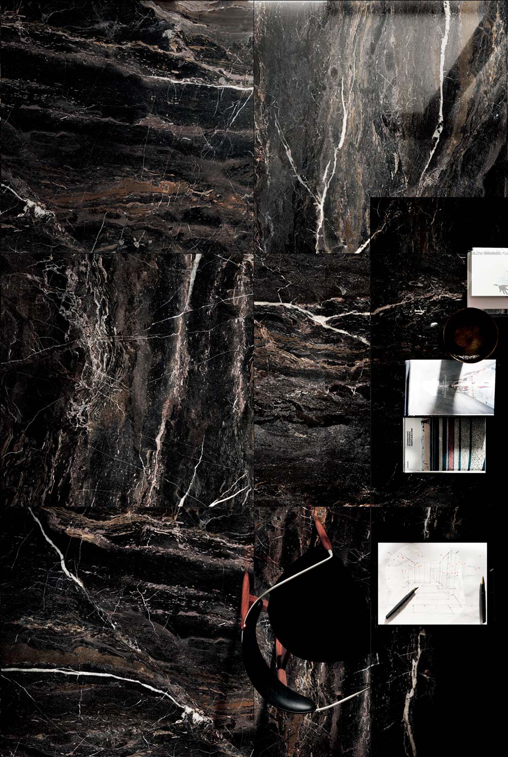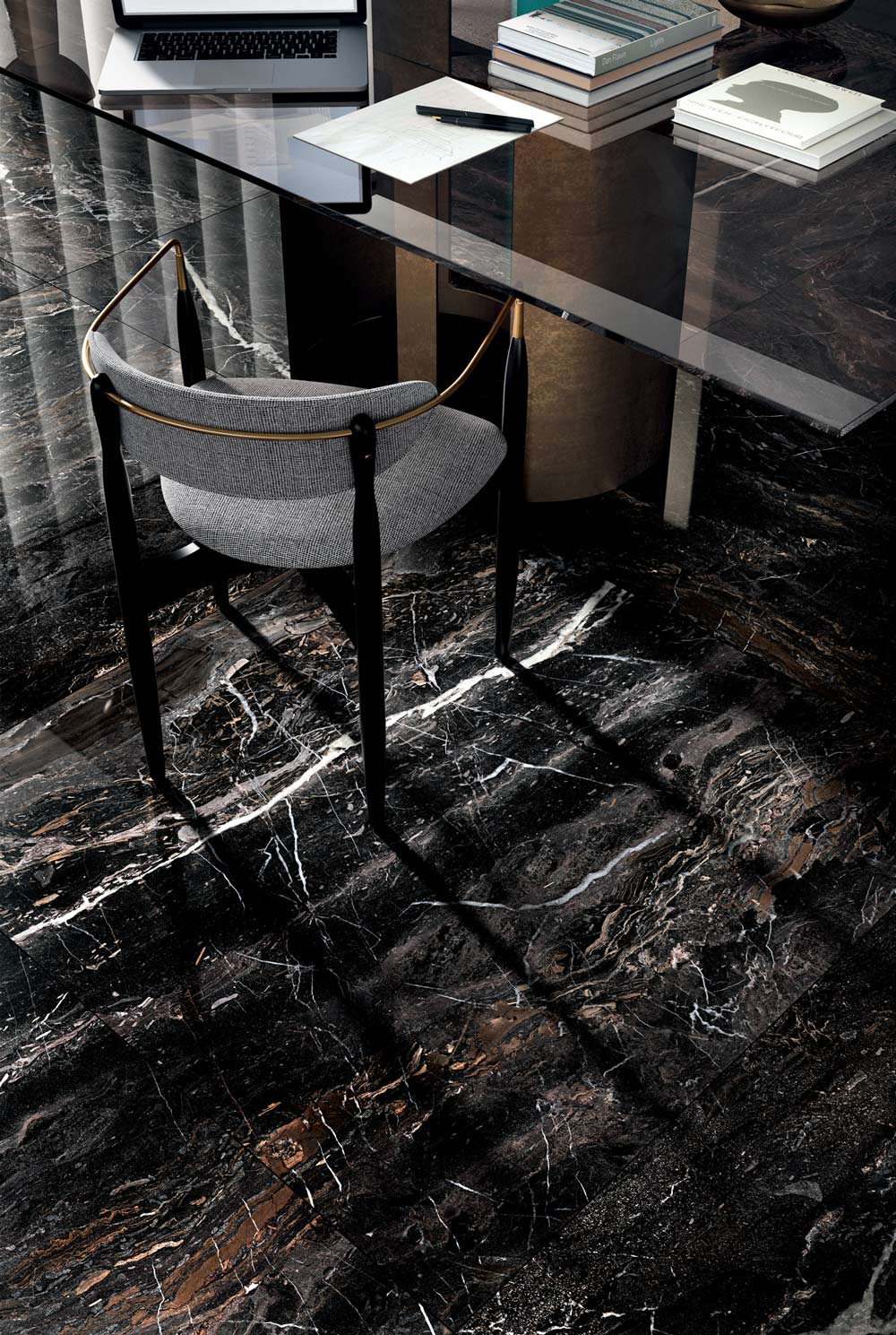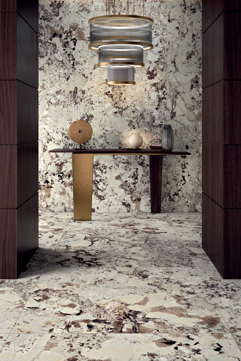 Deux inspirations minérales structurent la collection. Alaska, clair et lumineux, évoque la pureté des marbres blancs, avec des veines délicates qui captent la lumière et agrandissent visuellement les espaces. Orobico, plus expressif, révèle des nuances chaudes et profondes, animées de veines contrastées qui donnent du caractère aux projets les plus ambitieux.