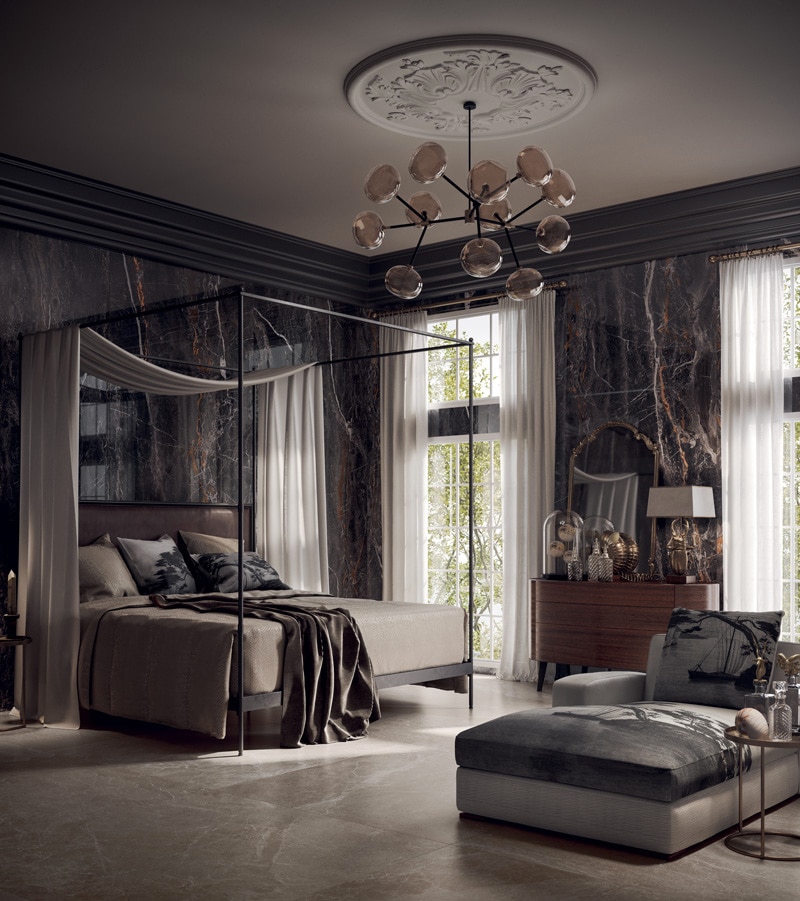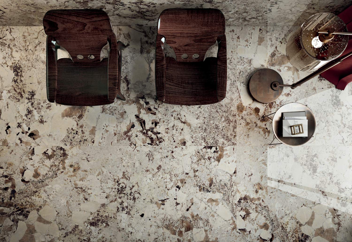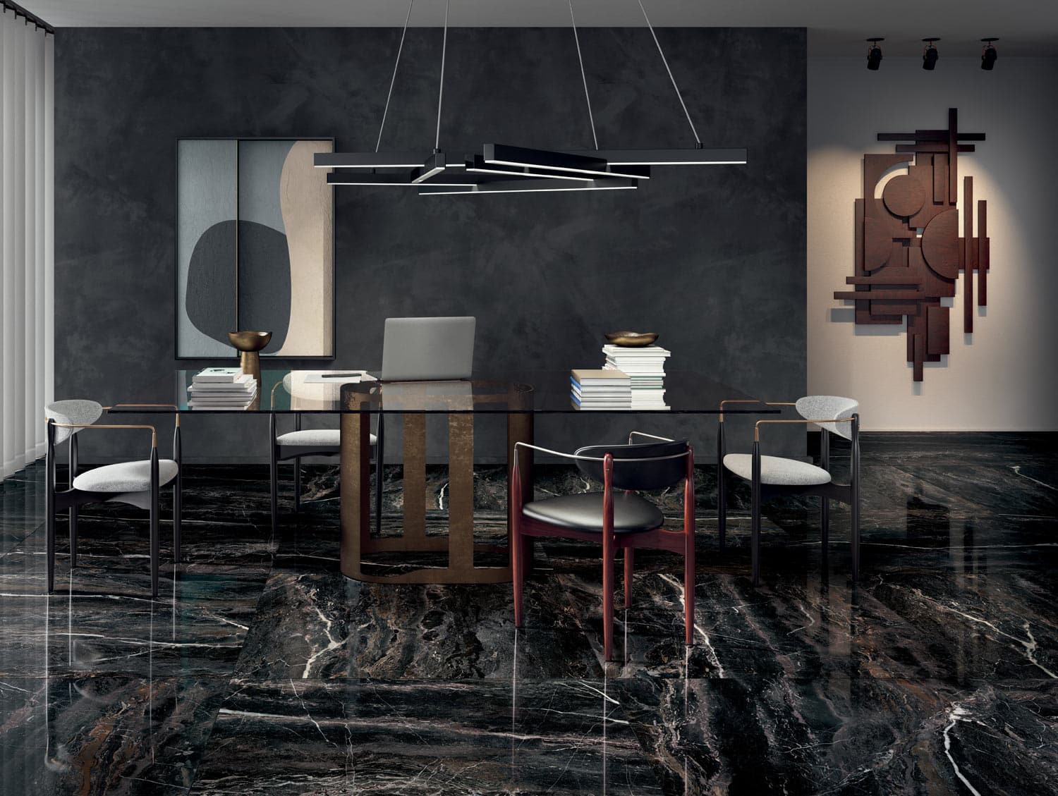 Deux inspirations minérales structurent la collection. Alaska, clair et lumineux, évoque la pureté des marbres blancs, avec des veines délicates qui captent la lumière et agrandissent visuellement les espaces. Orobico, plus expressif, révèle des nuances chaudes et profondes, animées de veines contrastées qui donnent du caractère aux projets les plus ambitieux.