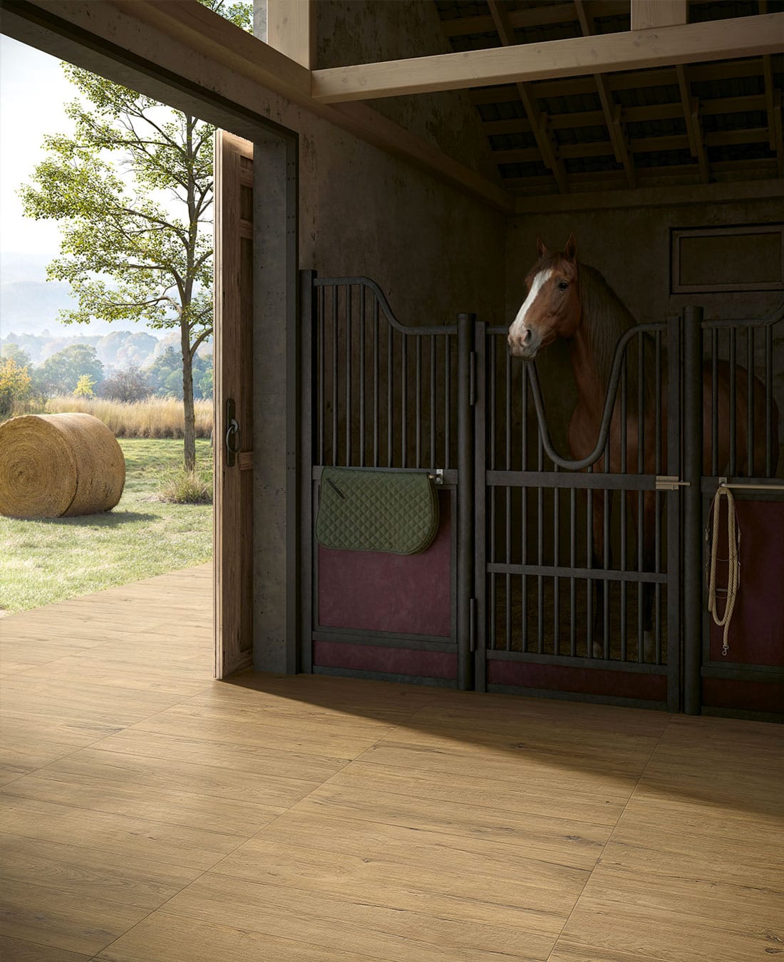 Pour l’extérieur, une finition antidérapante et des dalles de 20 mm d’épaisseur en 30×120 cm permettent une pose sur plots, parfaite pour les terrasses, plages de piscine et allées.