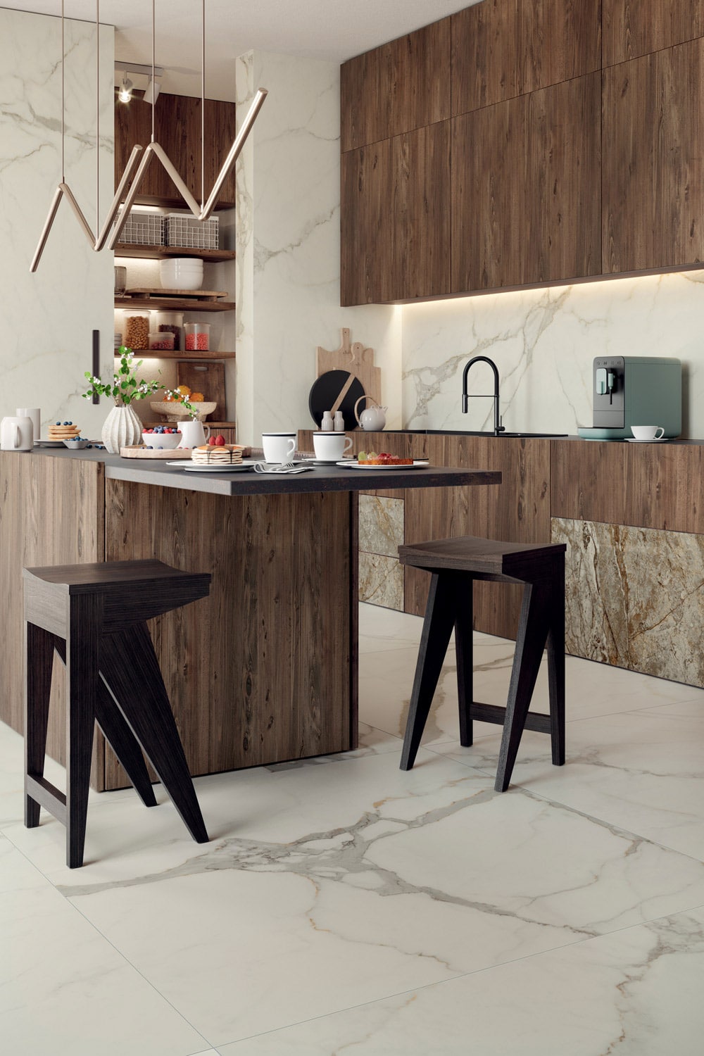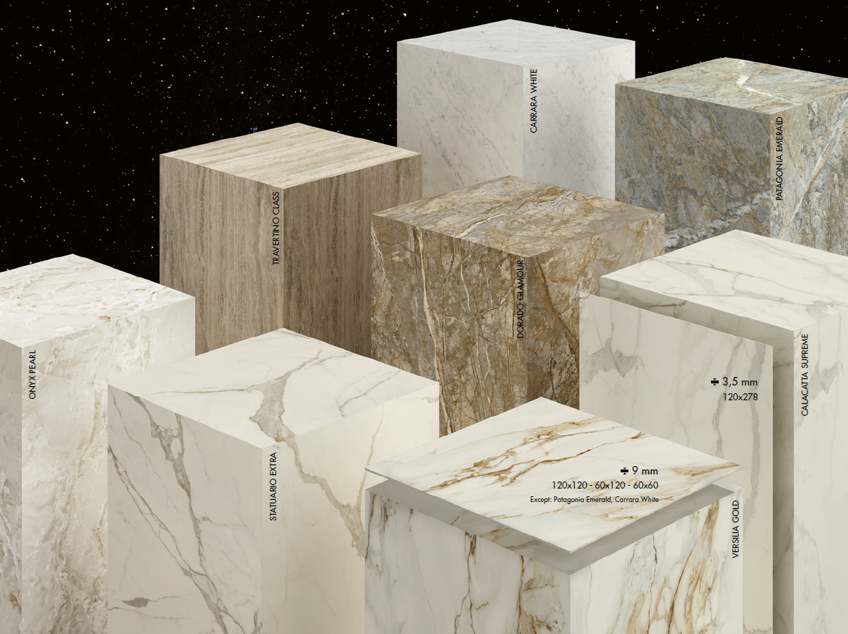 La collection STARLIKE réinvente le carrelage effet marbre grâce à un grès cérame laminé ultra-fin, combinant finesse extrême et réalisme saisissant. Inspirée par huit marbres naturels et précieux — Carrara White, Statuario Extra, Calacatta Supreme, Versilia Gold, Onyx Pearl, Travertino Class, Dorado Glamour et Patagonia Emerald — chaque plaque reproduit les veines et nuances minérales avec une authenticité remarquable.