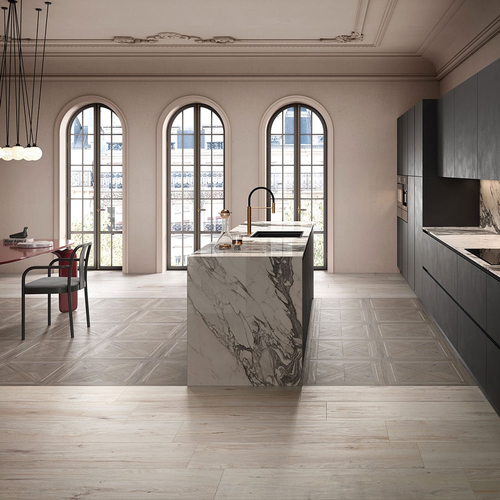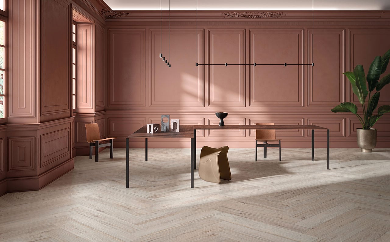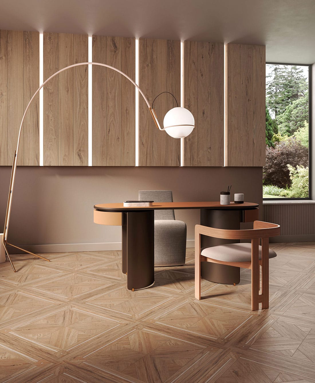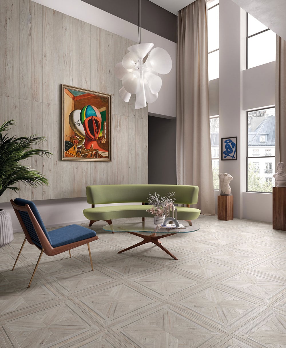 Disponible en quatre coloris (avorio, ambra, miele, tortora) — du bois clair lumineux aux tonalités plus profondes — FOGLIAME permet de composer des atmosphères naturelles adaptées aux intérieurs modernes comme aux projets plus classiques. Les cinq formats, dont la spectaculaire latte 20×180 cm, ouvrent la voie à de multiples calepinages : pose droite, décalée ou décorative avec le motif Intarsio, inspiré des parquets Versailles revisités.