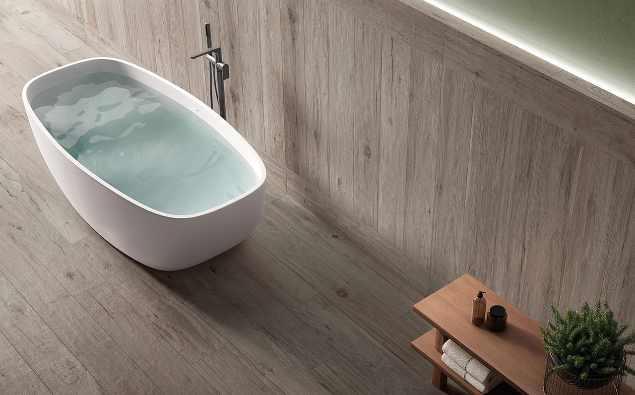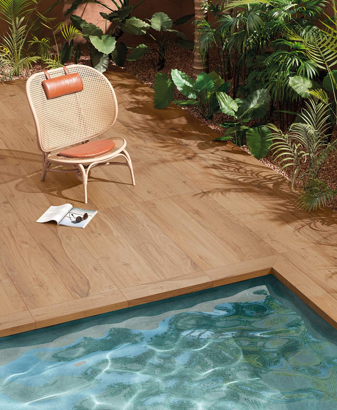 La collection propose deux finitions pensées pour conjuguer esthétique et fonctionnalité, ainsi qu’une version en 19 mm d’épaisseur dédiée aux terrasses et abords de piscine. Cette déclinaison extérieure conserve tout le charme du bois tout en offrant la robustesse du grès cérame.
