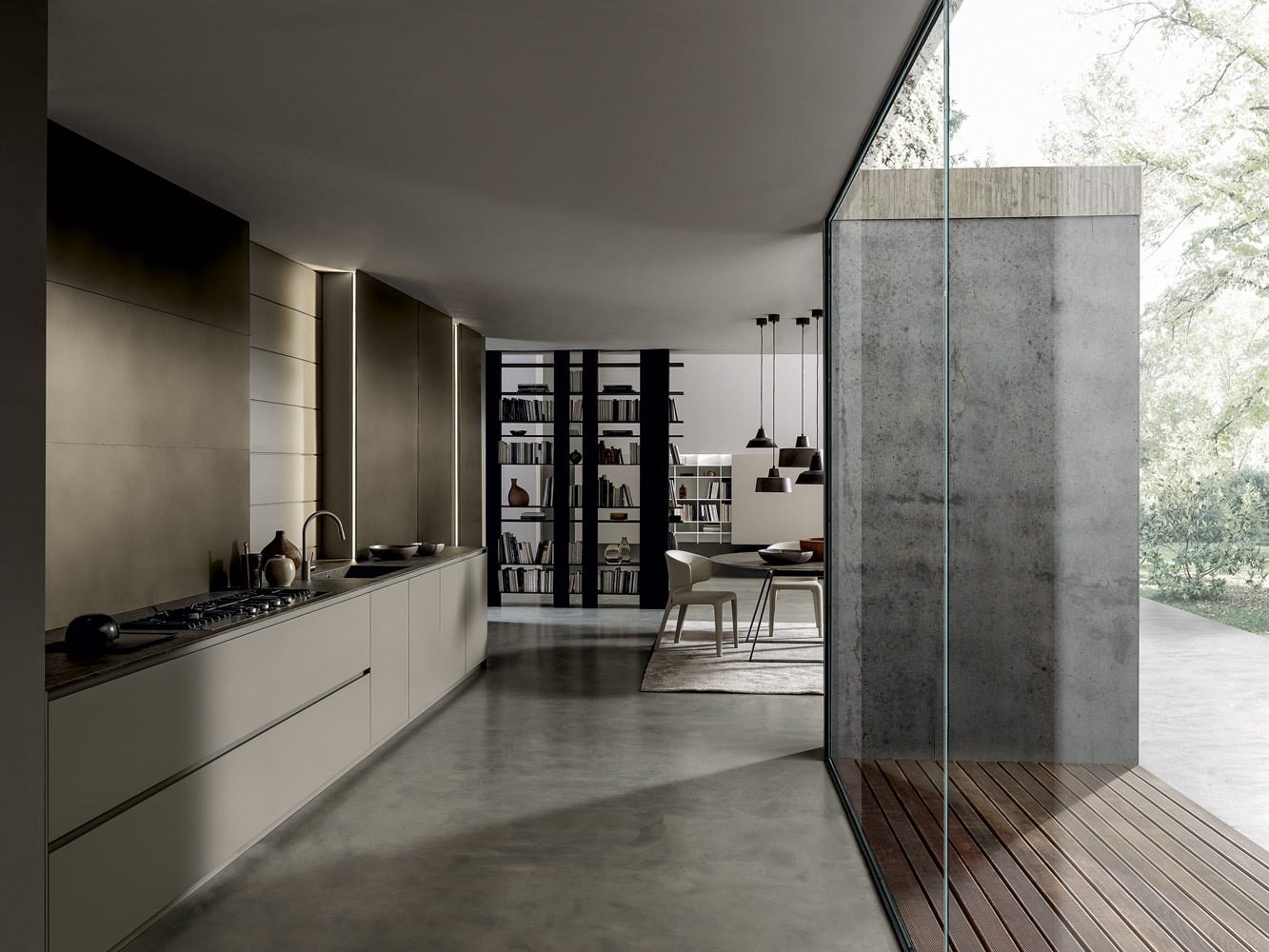 Linéaire de meubles bas dont les portes sont en aluminium alvéolaire de 1 cm d’épaisseur en finition laqué satiné beige tornabuoni, le plan de travail avec évier intégré est en grès cérame Emperador Marron brossé.