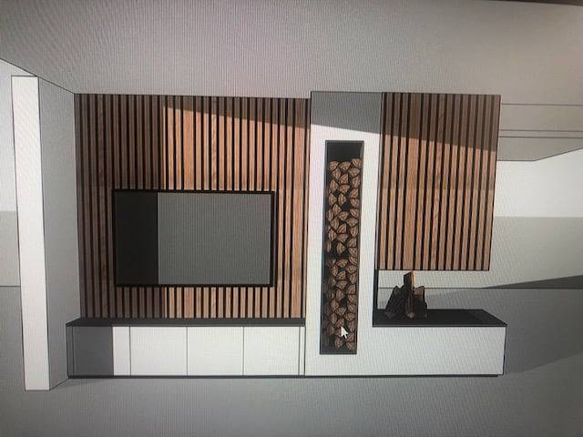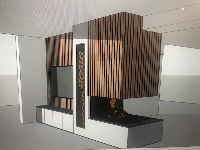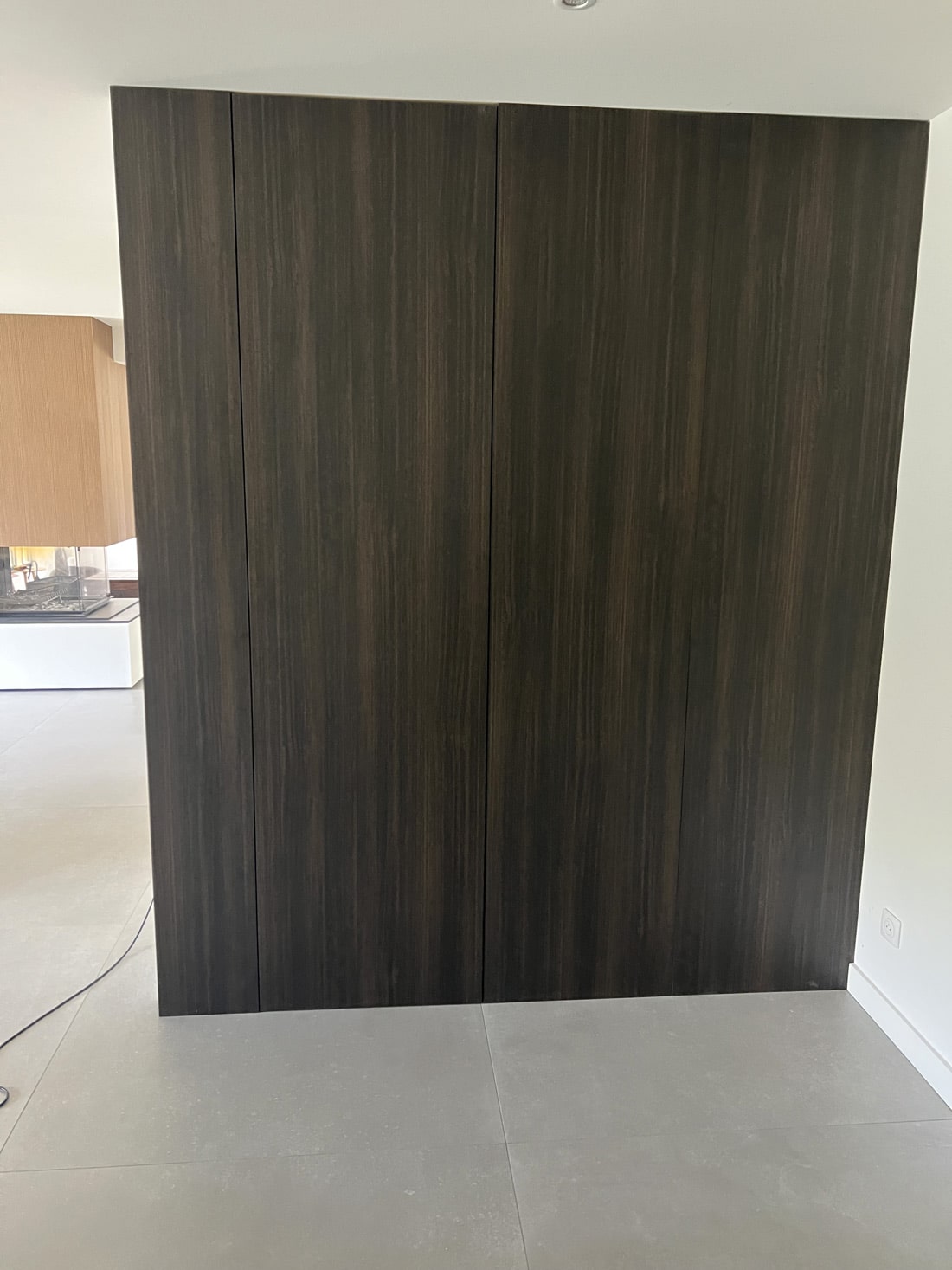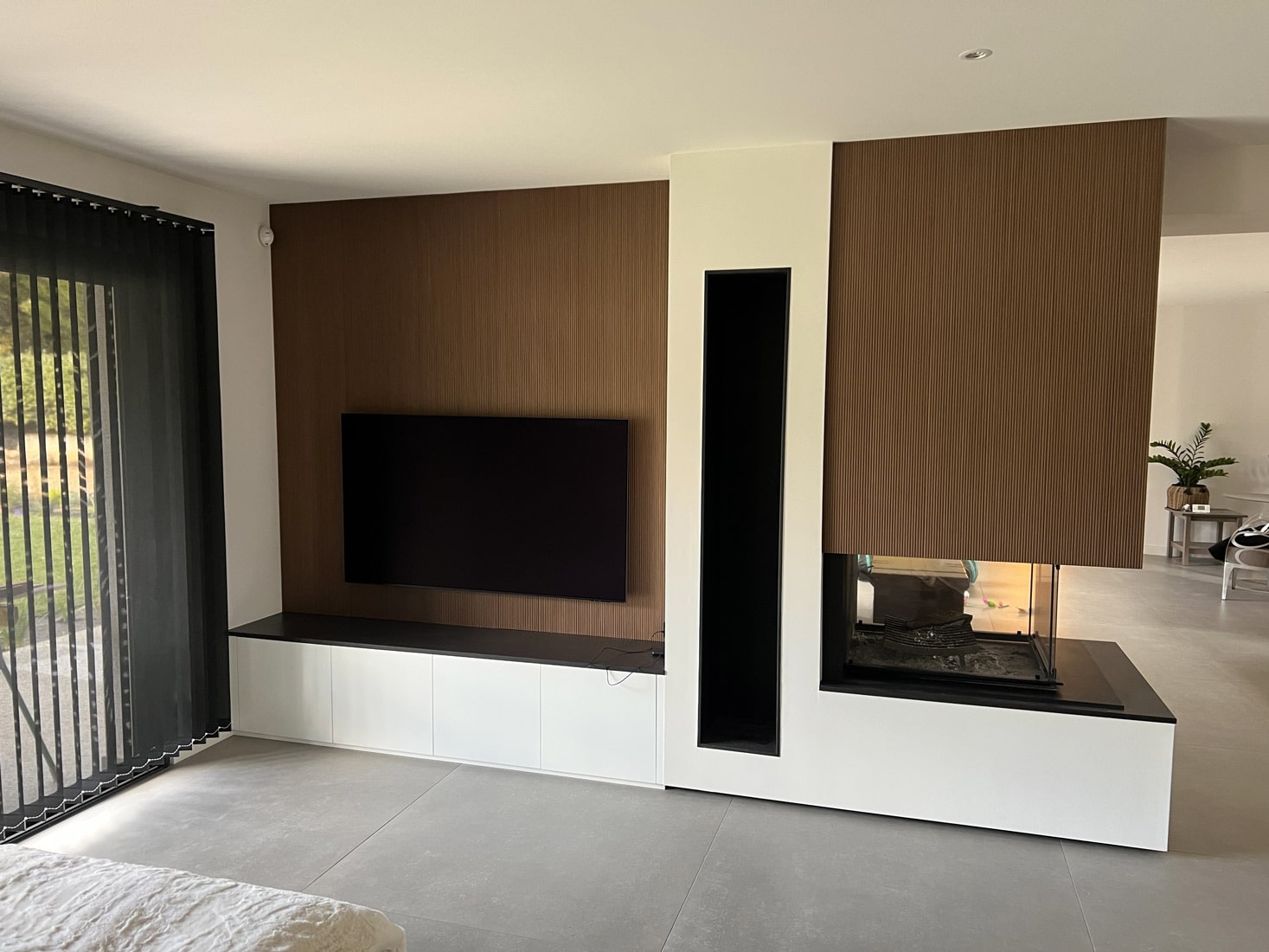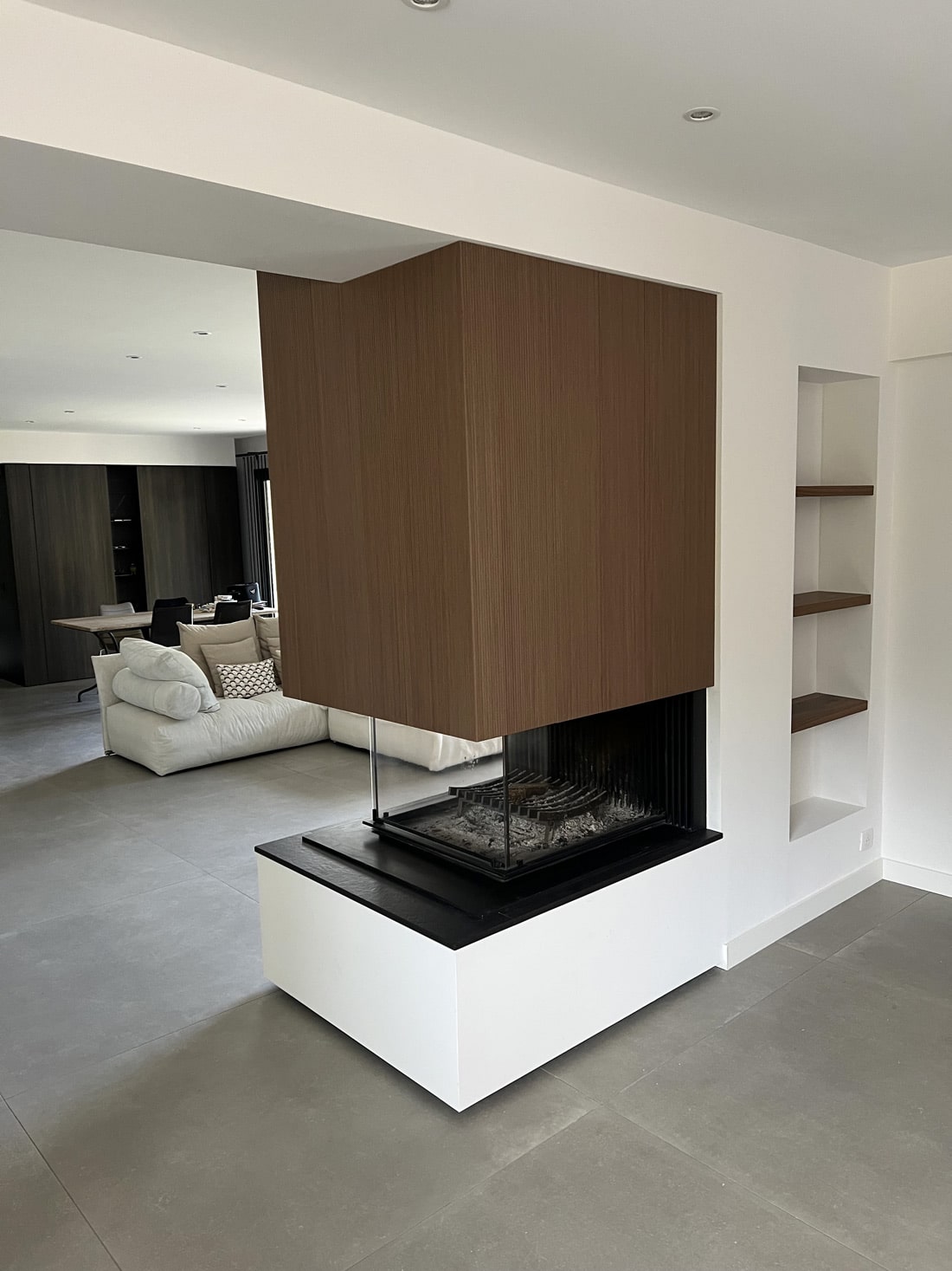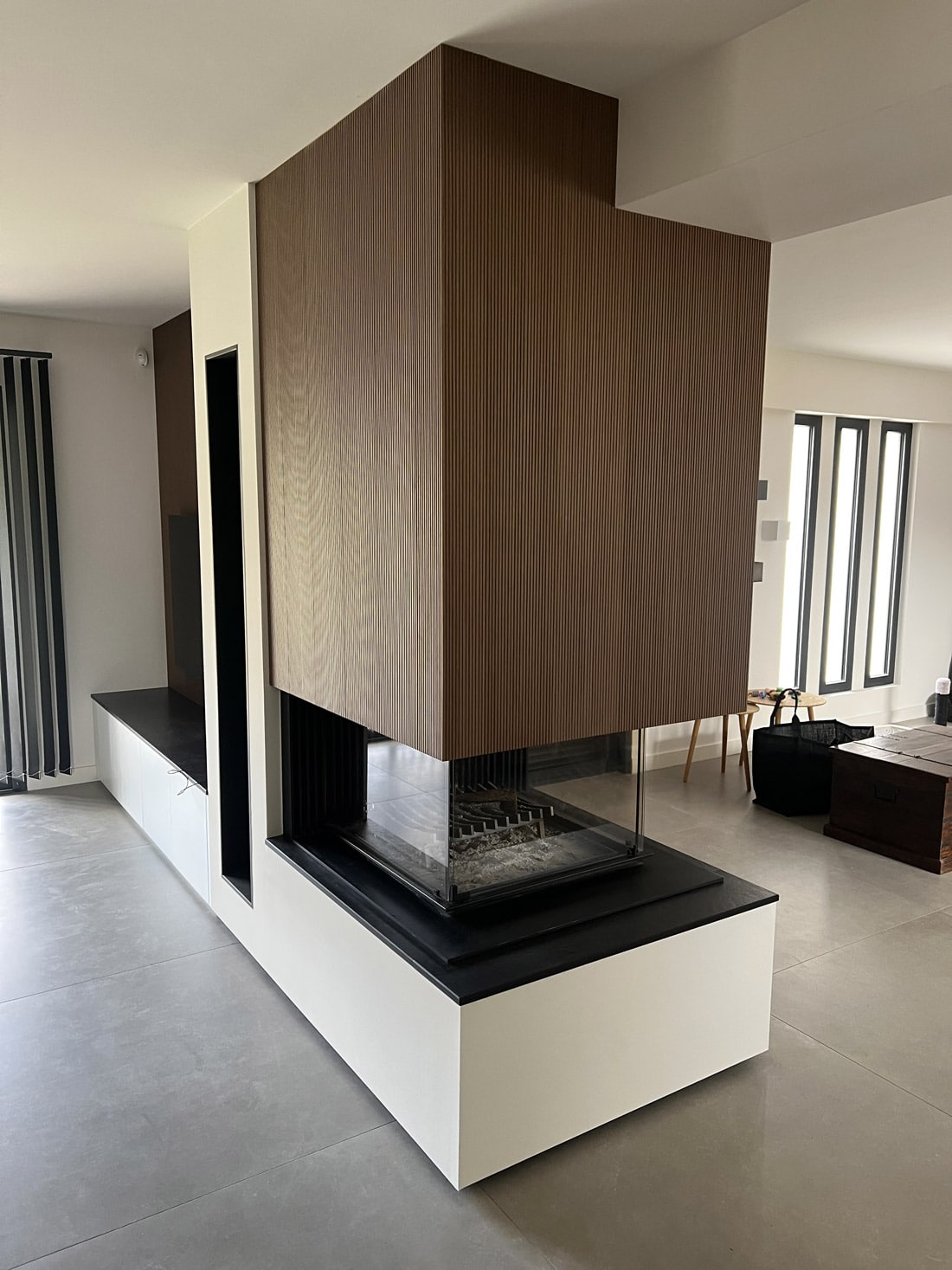 - Meuble de séjour (caissons bois Rovere Carbone – habillage mural lames en pierre naturelle Pietra Piasentina – Portes en aluminium teinte Bronze Dust