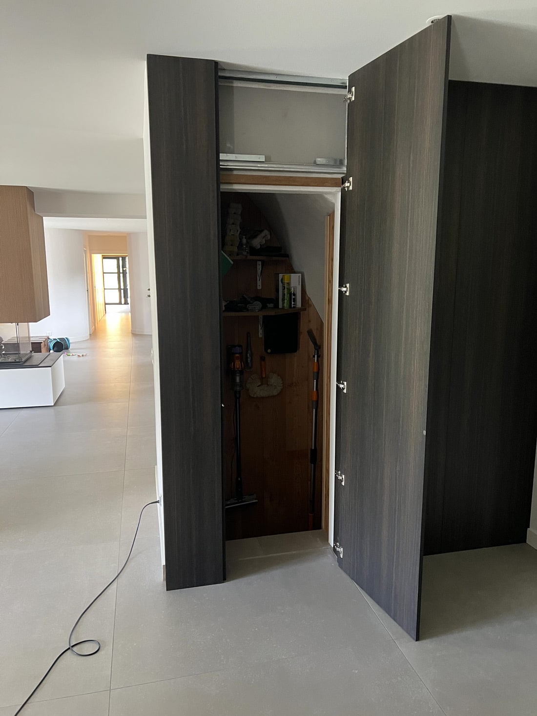 Dressing sur-mesure, Porte invisible toute hauteur, Carrelage mural TV, carrelage séjour, terrasse et intérieur de piscine.